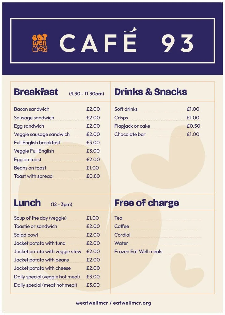 Running Café 93 is part of our commitment to exploring new, meaningful ways to deliver our mission: providing access to nourishing food for people experiencing hardship across Greater Manchester.